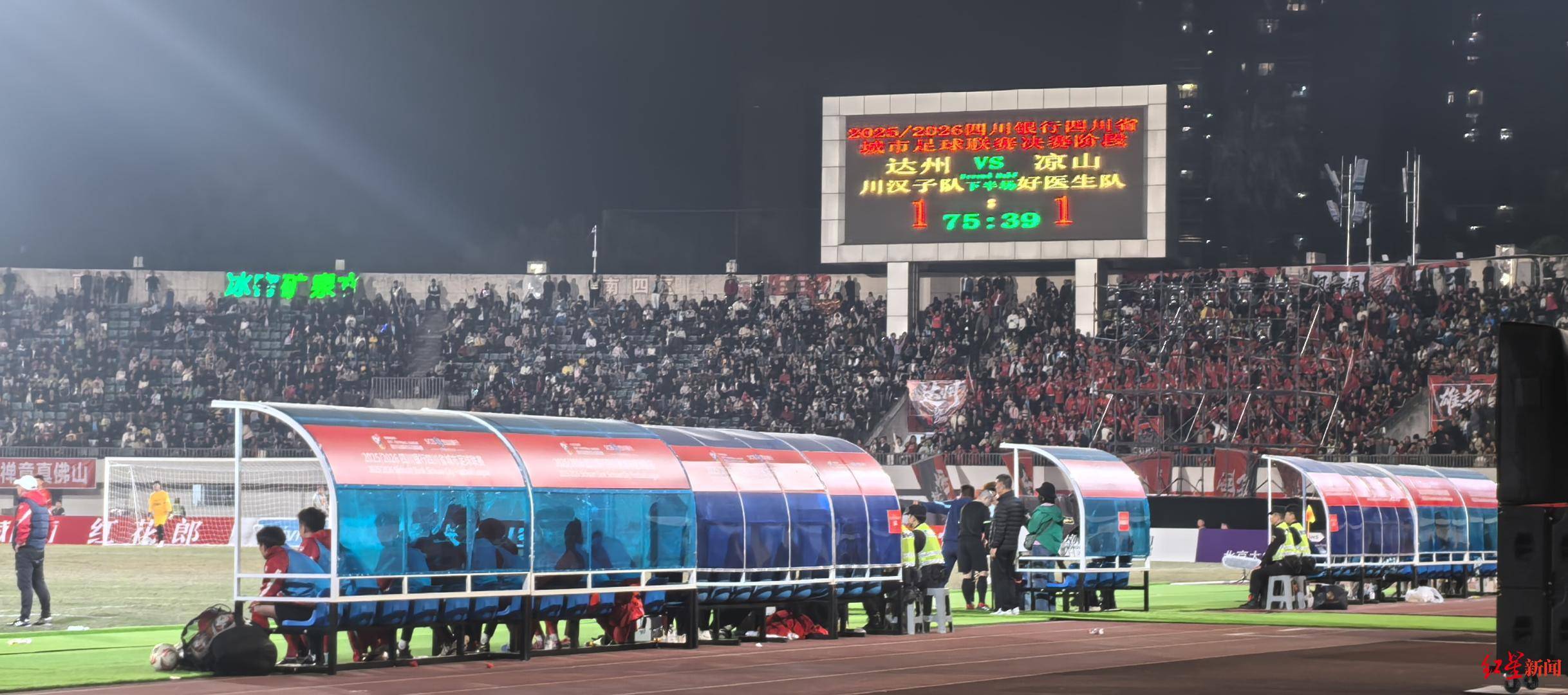直到第74分钟,达州队同样靠任意球攻破凉山队球门,将比分改写为1比1,全场2万余人高声欢呼,这一比分也维持到终场。