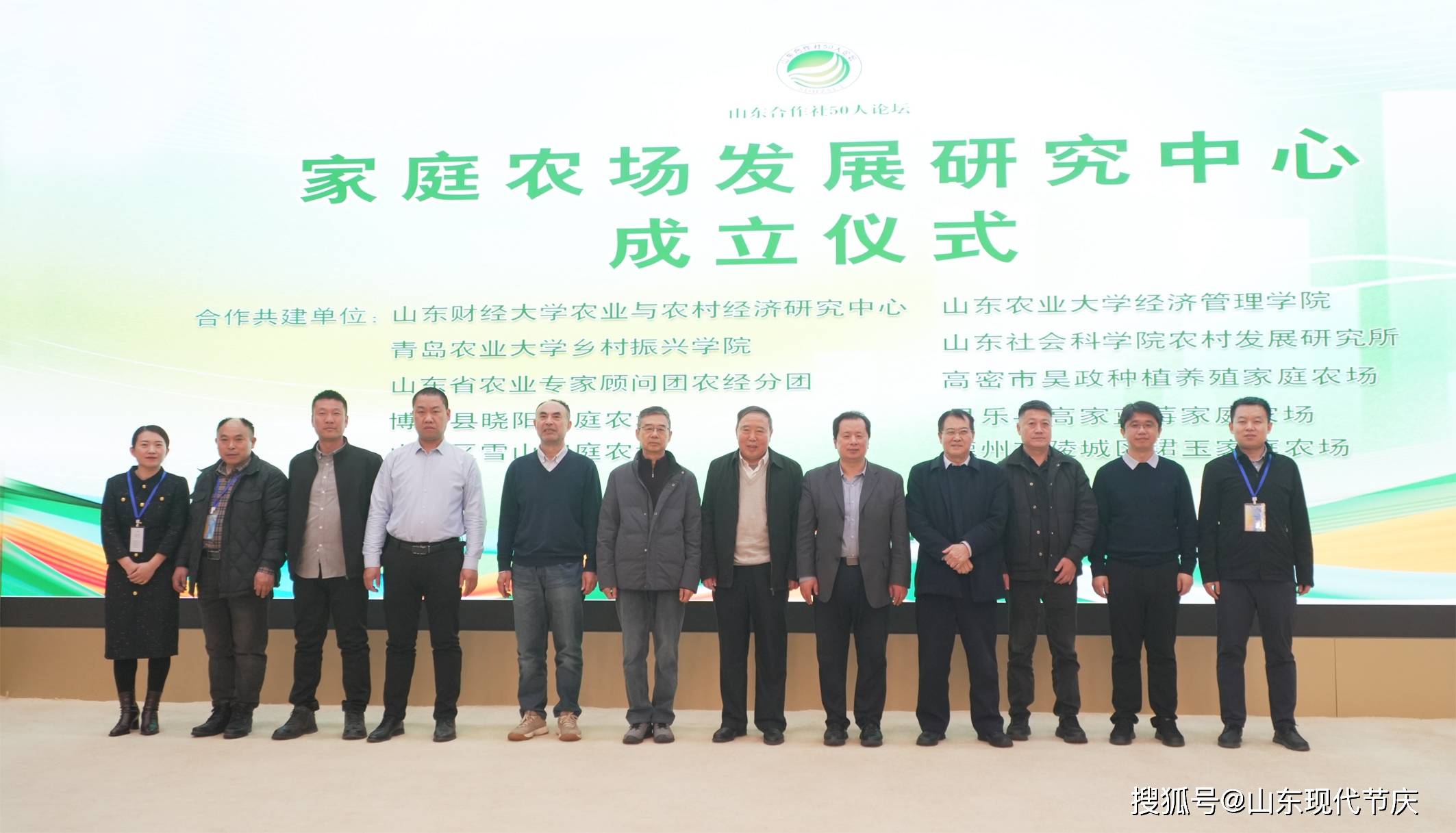 山东省委原副秘书长、省委农工办原主任王泽厚(右六), 山东财经大学教授王蔚(右四), 山东省供销合作社联合社原巡视员孙国伟(左六), 中国合作经济学会副会长、山东省合作经济研究会会长、青岛农业大学乡村振兴研究院常务副院长李中华(右五),山东农业大学经济管理学院副院长、硕士生导师牛浩(右一),山东社会科学院农村发展研究所所长樊祥成(右二),山东社会科学院研究员张清津(左五),山东省农业农村厅农村合作经济指导处三级调研员陈洁(左一), 高密市昊政种植养殖家庭农场农场主李友军(左四), 栖霞市亭口镇刁家村党支部书记王仁波(左二), 爱在渡口生态农业(山东)有限公司总经理柳榴(左三), 章丘区官庄街道石匣村党支部书记景华(右三)出席揭牌仪式