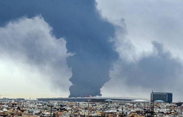 这张3月25日在科威特首都科威特城拍摄的照片显示,位于费尔瓦尼耶省的科威特国际机场一油库遭袭后冒起浓烟。图源:新华社