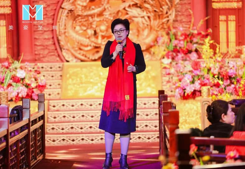庆典现场,美姿链集团董事长----智美体系创始人,美姿至纯品牌创始人,丁妍君董事长贺年致辞,她衷心感谢每一位品牌消费者,感谢直营店、加盟店工作人员,感谢每一位代理对品牌,对公司,对高管团队的认可。